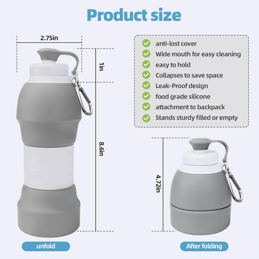 Collapsible Water Bottle, Upgrade Leak-Proof Reusable BPA Free Silicone Sports Bottles, Portable Refillable Water Bottles with Carabiner, Ideal for Travel Hiking Outdoor Camping Gym (Gray)