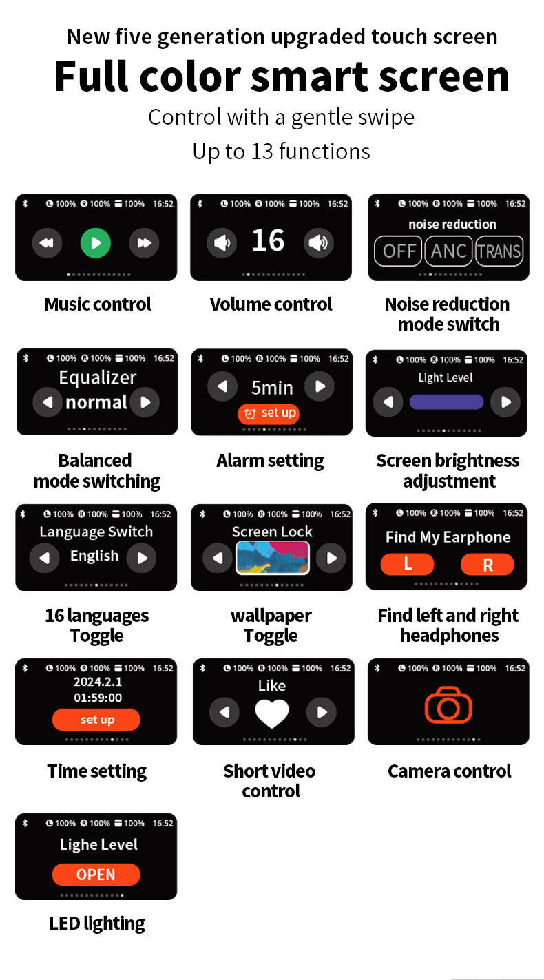 - 【INTELLIGENT TOUCH SCREEN HEADPHOENS】: Touch screen Bluetooth headset equipped with LCD full color 2.01 inch MP3 play music, message reminder, multi-wallpaper switch use, make and receive calls, 12 languages, vibration reminder, volume adjustment, up and down song switch, wake up mobile phone butler, music game dual mode, and other 10 kinds of functions